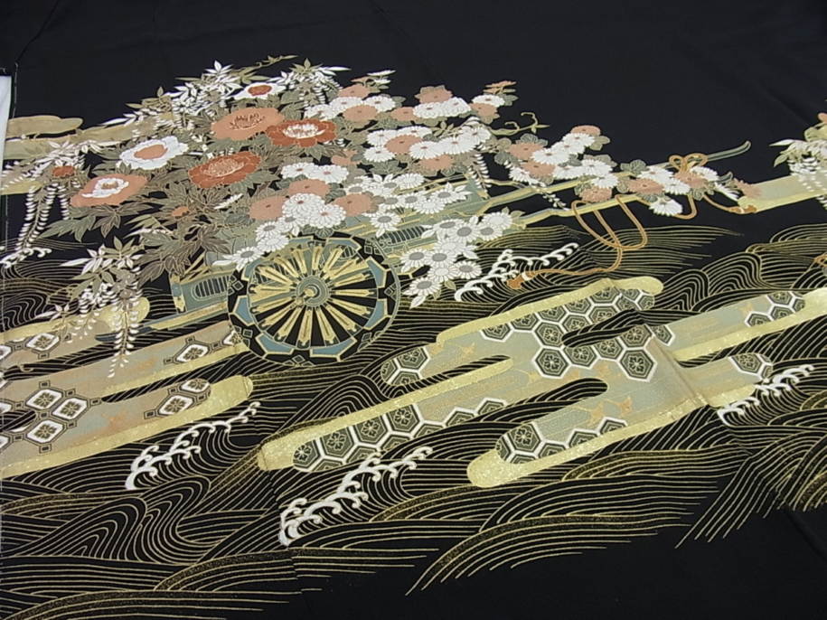 今回お買取させていただいたお品物は、豪華黒留袖・駒刺繍・吉祥立波花車文の着物になります。