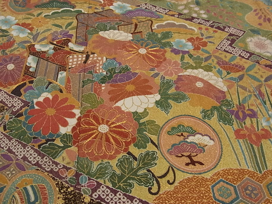 駒刺繡された宝尽くし吉祥文の文様がとても洗練されていて金彩も相まって上品かつ綺麗で素敵だなと思いました。