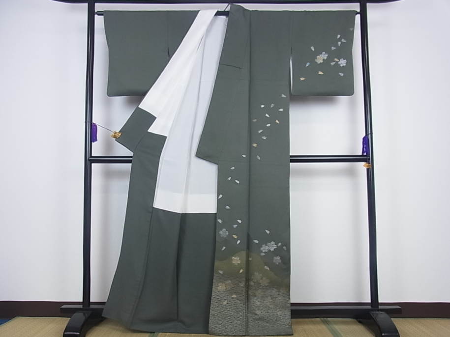今回お買取させていただいたお品物は、訪問着・舞桜遠山文・金彩の着物になります。