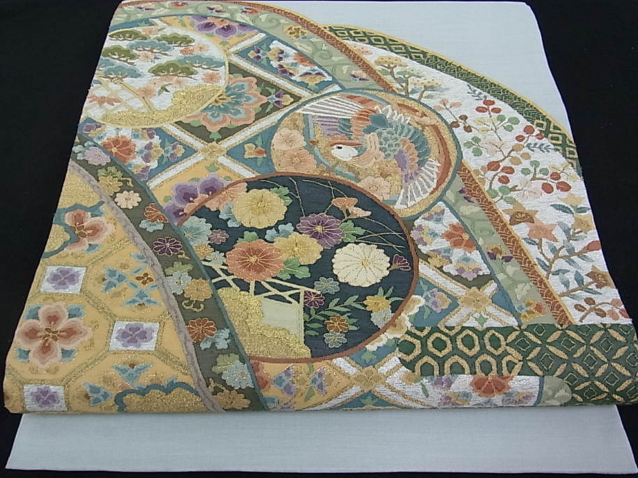 【帯】太鼓柄袋帯 明綴れ 遠山吉祥花丸文